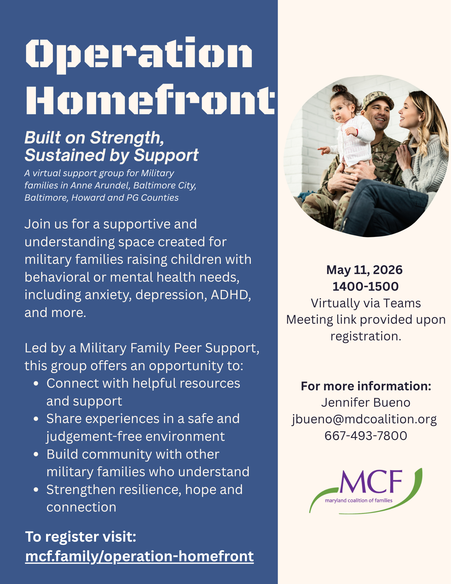 Join us for a supportive and understanding space created for military families raising children with behavioral or mental health needs, including anxiety, depression, ADHD, and more.